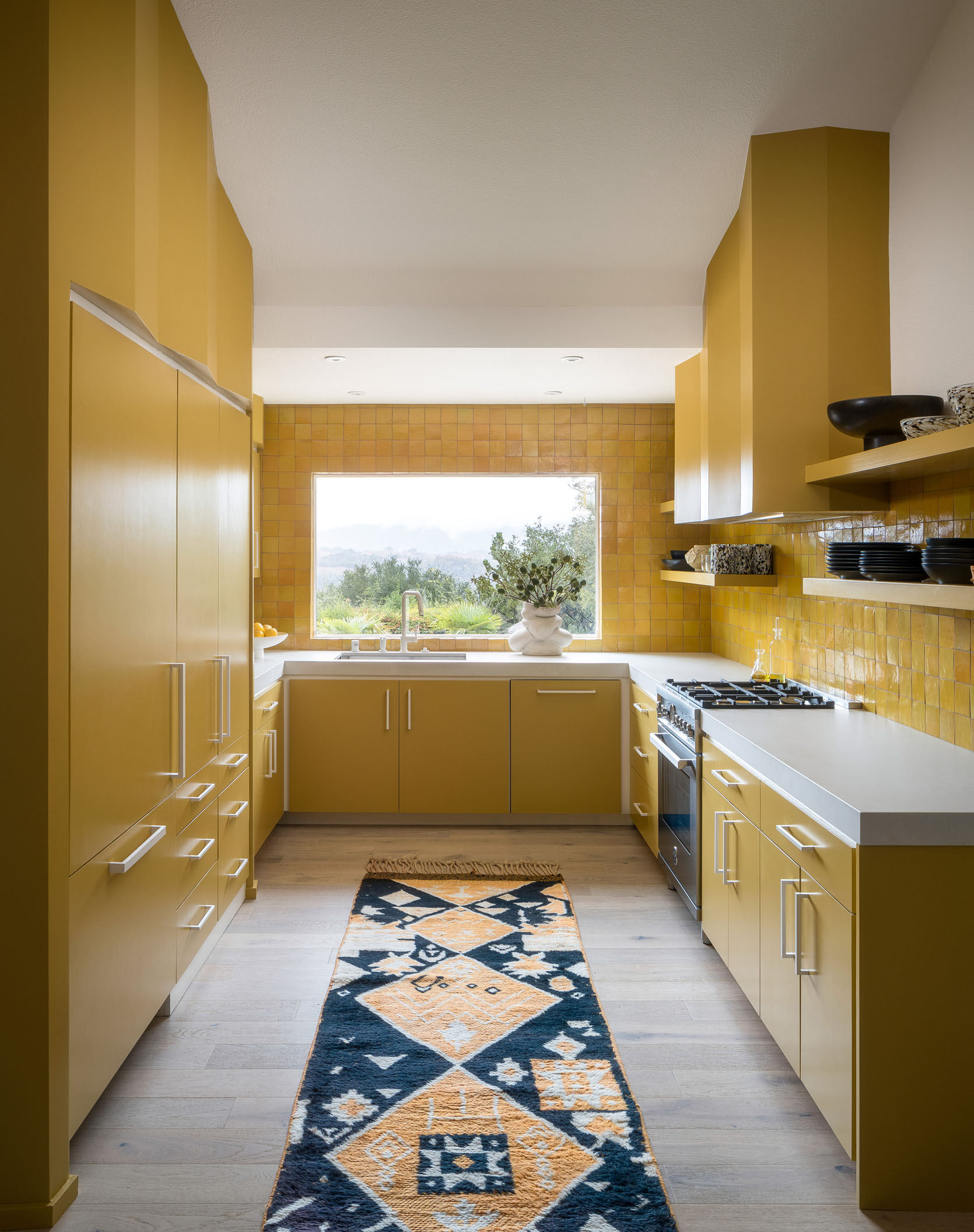 “We think the monochromatic look is done best when you fully immerse the room in the chosen color but change things up with a complimentary neutral and varying textures. For this kitchen, we complimented the bold yellow with a bright white and brought it through in cabinetry details, the countertop, plumbing fixtures, and hardware. On the reverse side of things, we chose the use of yellow in two ways- through the use of the color Dylan from Portola Paints saturating the cabinetry and geometric walls and the cadmium zellige from Zia Tile that has a color story all on its own.”