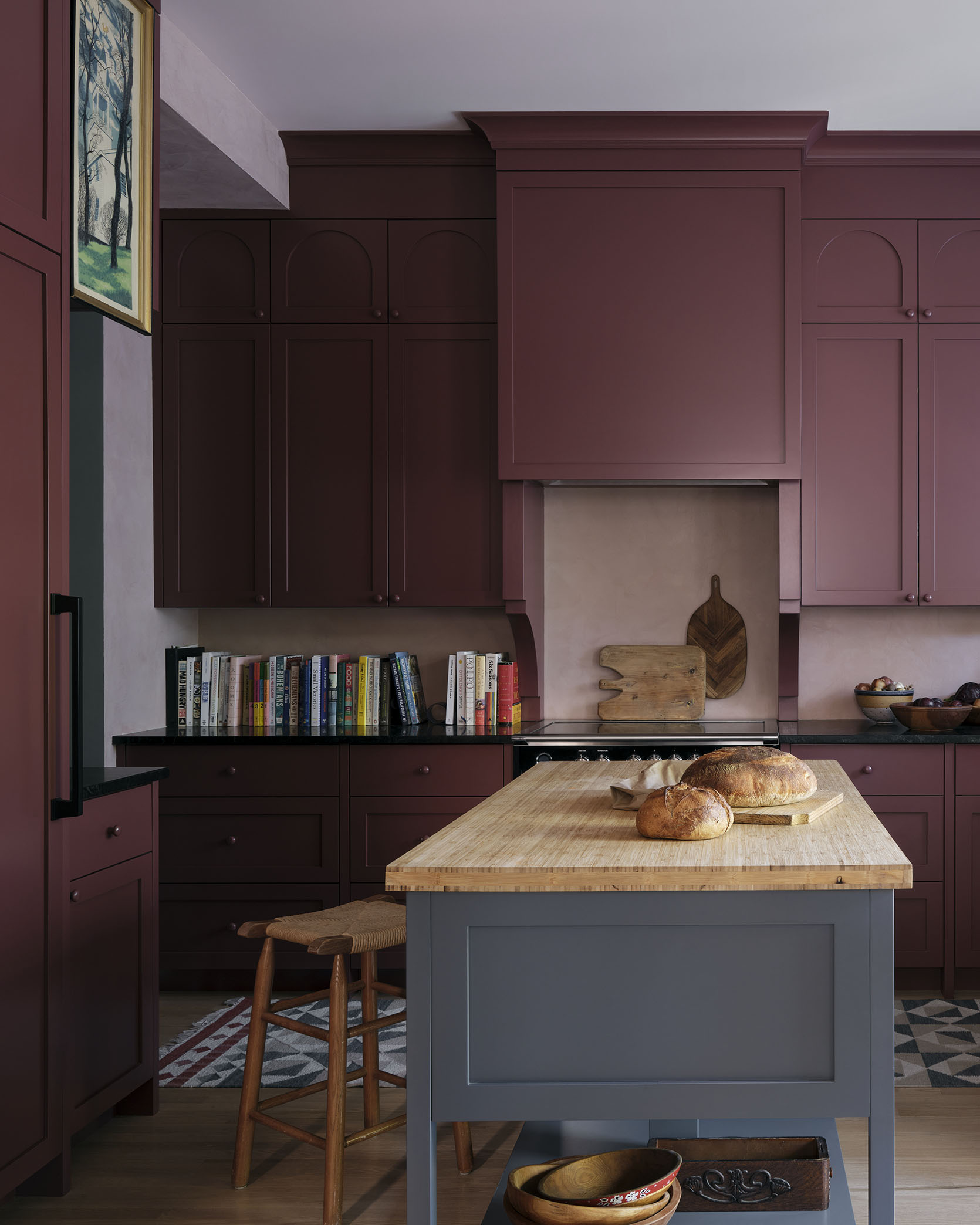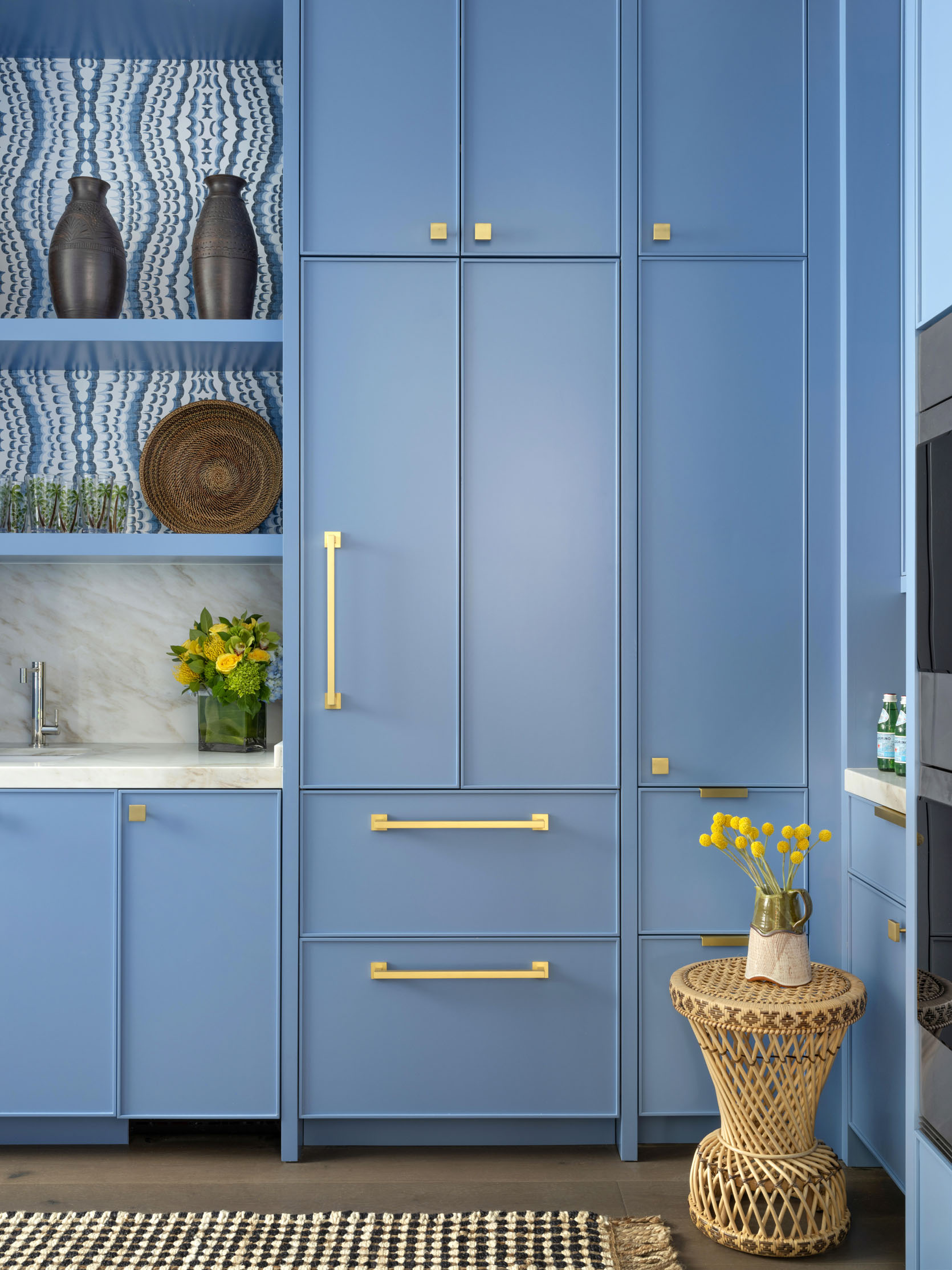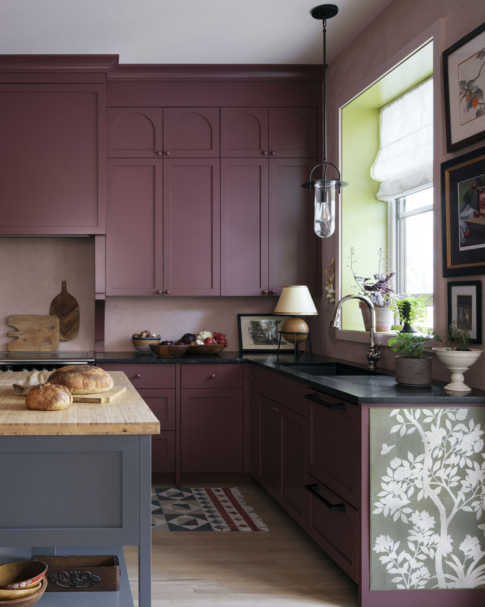 Surprise! A double-trend kitchen by the talented Sophie Dow Donelson and Celia Bryson Design. First the “handpainted” naturescape detail and now the two-toned colorful kitchen. This one could actually almost work for the colorful monochrome trend too with all the purples. However, despite falling into these trend categories, I don’t look at this kitchen and think “this is a trendy kitchen.” Instead, I think this is a joyful, colorful kitchen with both wonderful traditional and modern elements. Also, look at the eggplant color and blue color. They both live in the same tonal world which is why they work so well together.