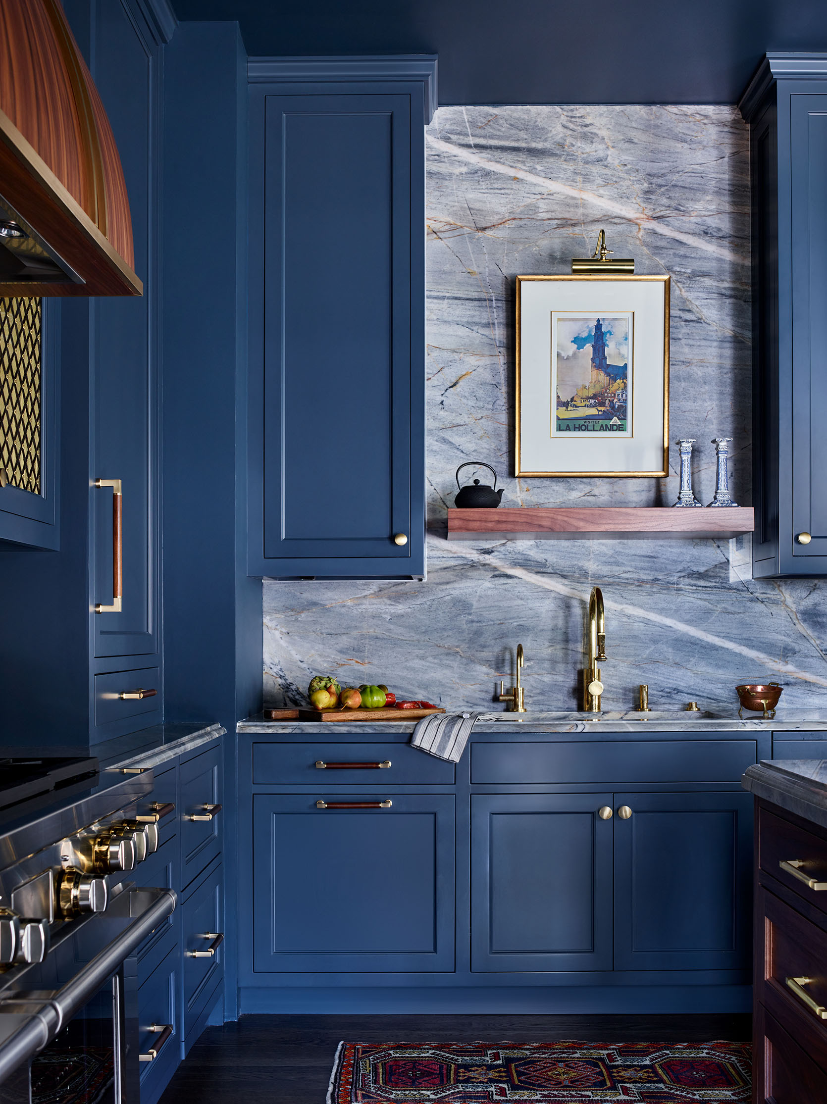 Next up is a kitchen the wonderful Joy Williams designed for the Southeastern Showhouse. Joy took this pretty blue and instead of using tile to get the monochromatic look like the Homme Boys did, she chose wallpaper. Not only is it a pretty option in and of itself, it’s a great affordable alternative if you love the statement of say, a bold marble but don’t quite have “a bold marble” budget. I also really love how she balanced the busyness of the wallpaper pattern with the lightly veined stone countertop and backsplash. This way your eye isn’t overwhelmed and is actually drawn upward.