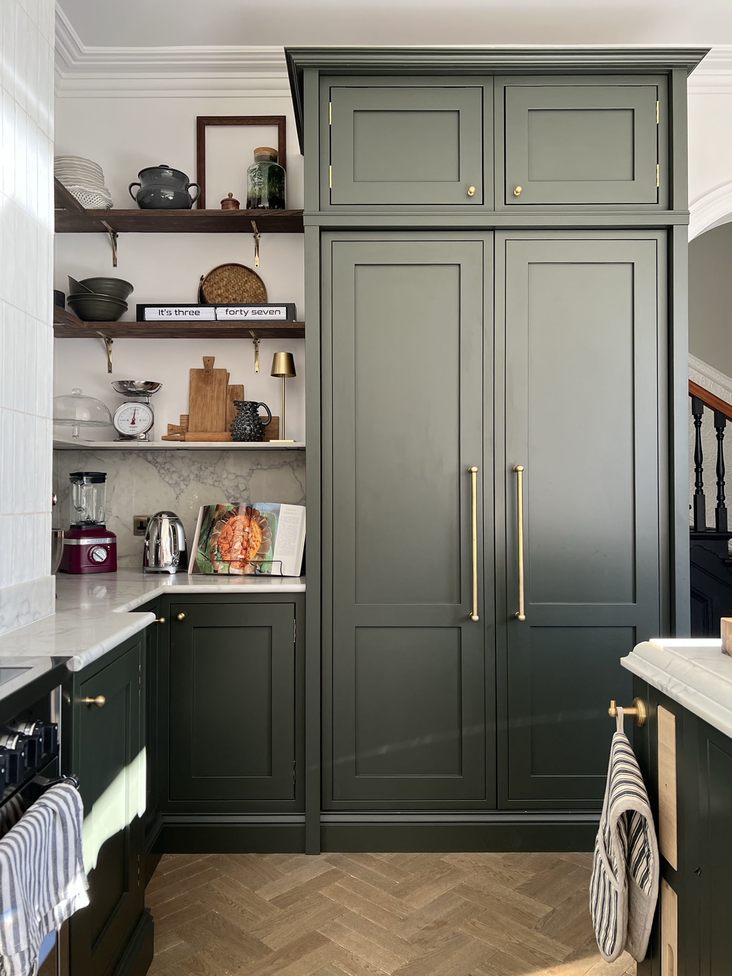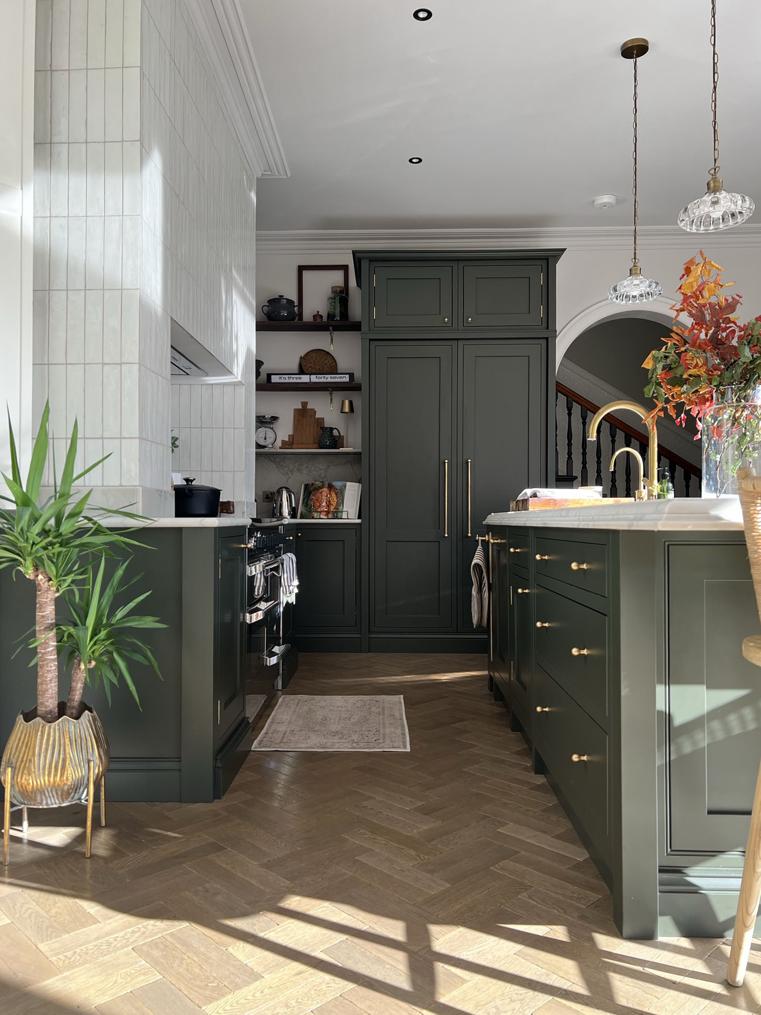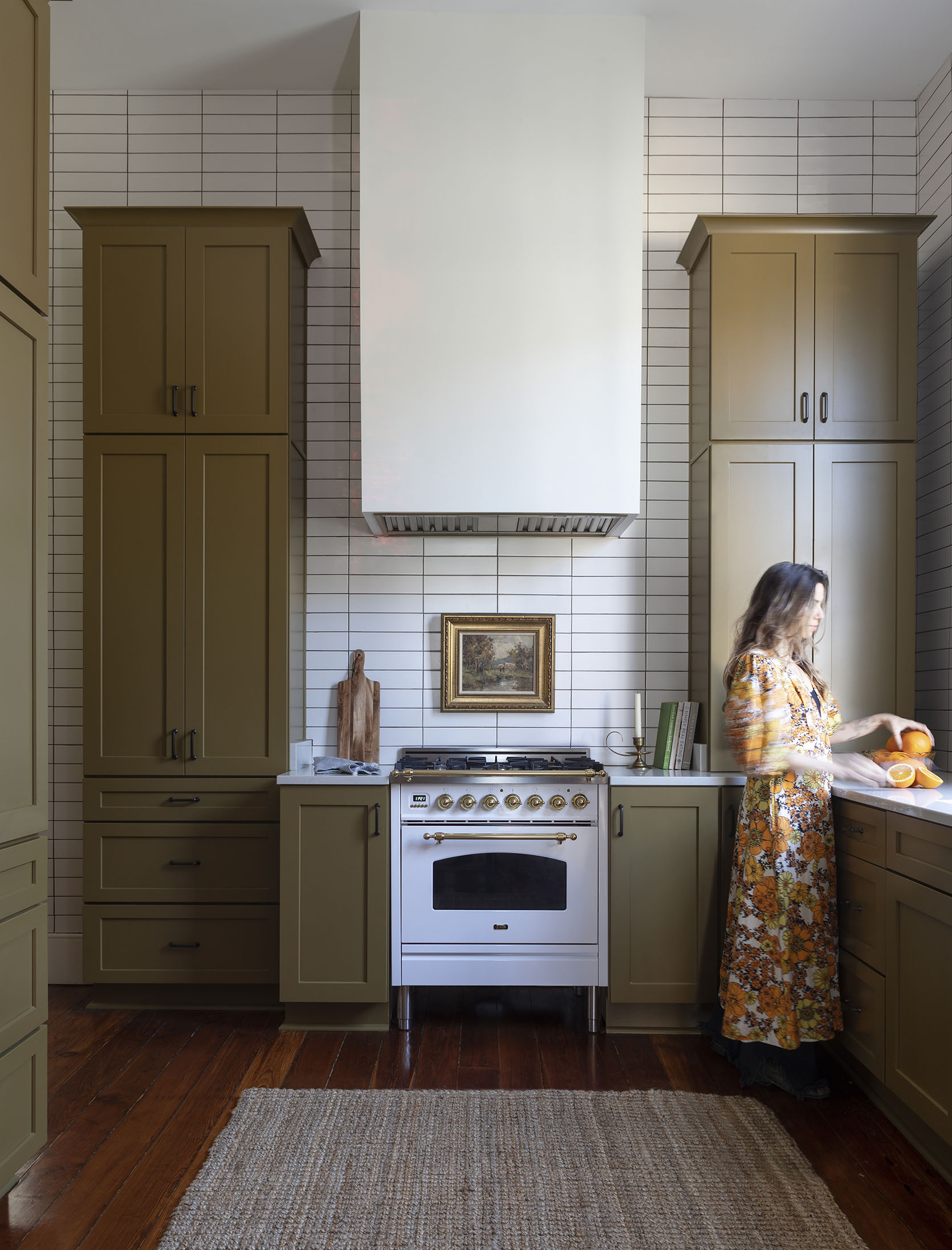 Let’s go even darker and saturated. Now, this cabinet color is still in the same family but far more green and is so pretty. It feels modern but really grounded. The whole mix of a modern subway tile, a vintage-inspired range, and modern traditional cabinetry is so beautifully balanced. Studio BKA Architects nailed it.