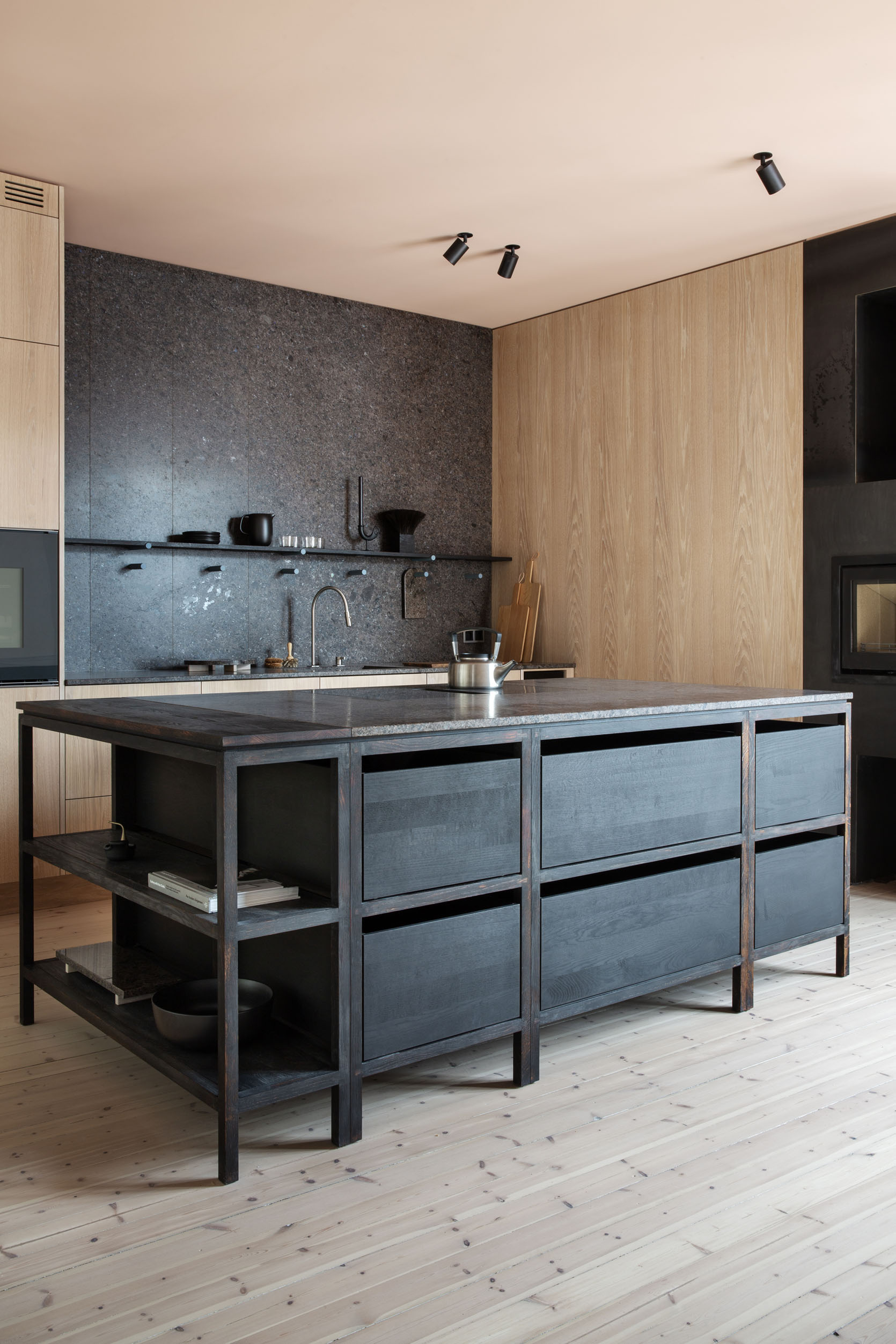 I mean look at this kitchen designed by Kosa Design! Those metal cabinets are the perfect moody contrast to those natural warm wood cabinets and ridiculously pretty views. But notice how the metal has a ton of movement. It makes them feel connected in the space given everything else has a lot of movement (ie. the wood and the stone…and that view:)).