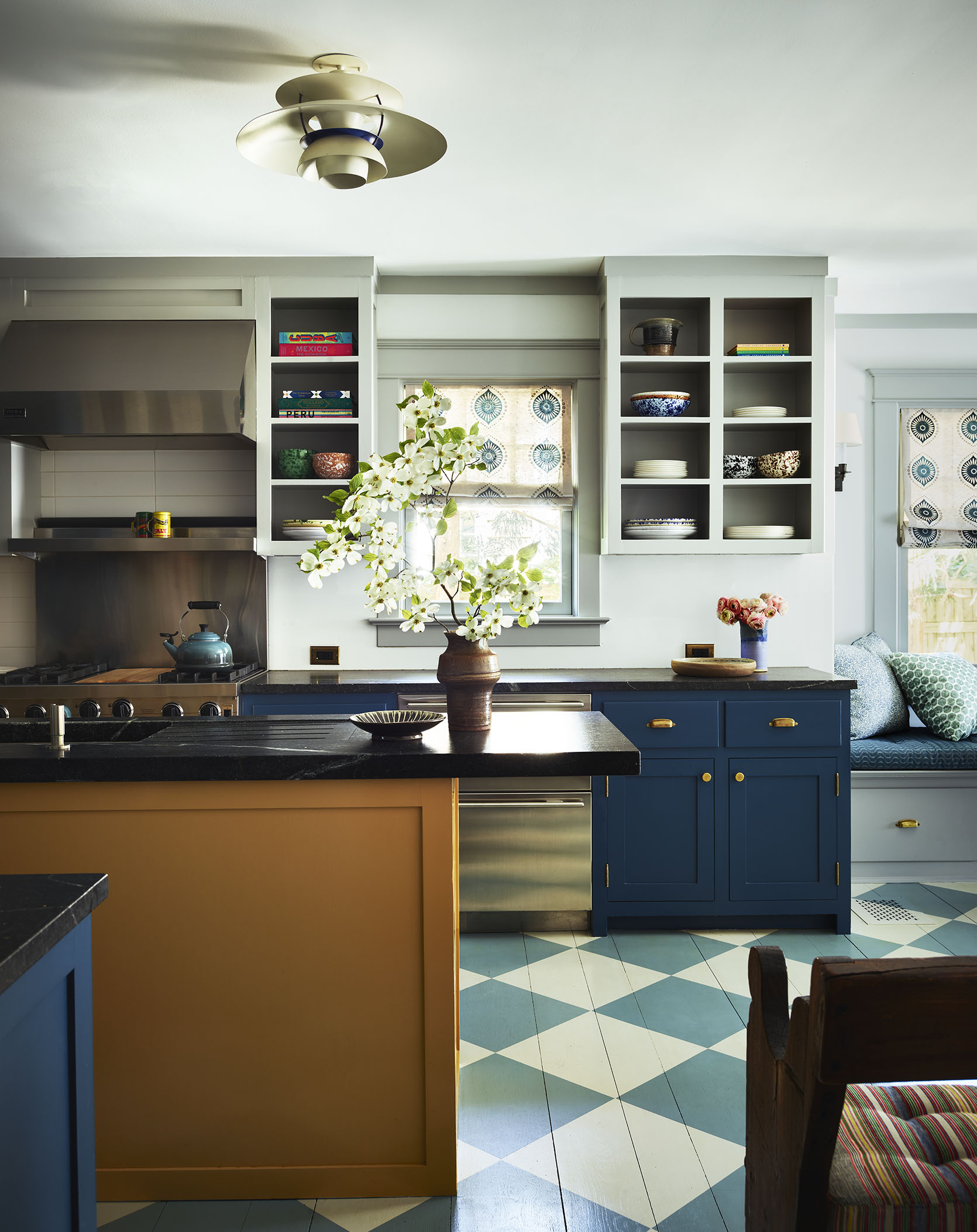 Can you believe how beautiful this kitchen is by Charlie Ferrer?? And by two-toned I really mean multi-toned. I love that they chose to go for a soft blue for the uppers and they go really saturated for the bottom cabinetry. Then to really up the happy dial, a mustard yellow island. I think because the top half of the room is visually very calm that this doesn’t feel overwhelming. It’s just awesome. I also will never not love a diamond-patterned floor (especially painted on top of wood).