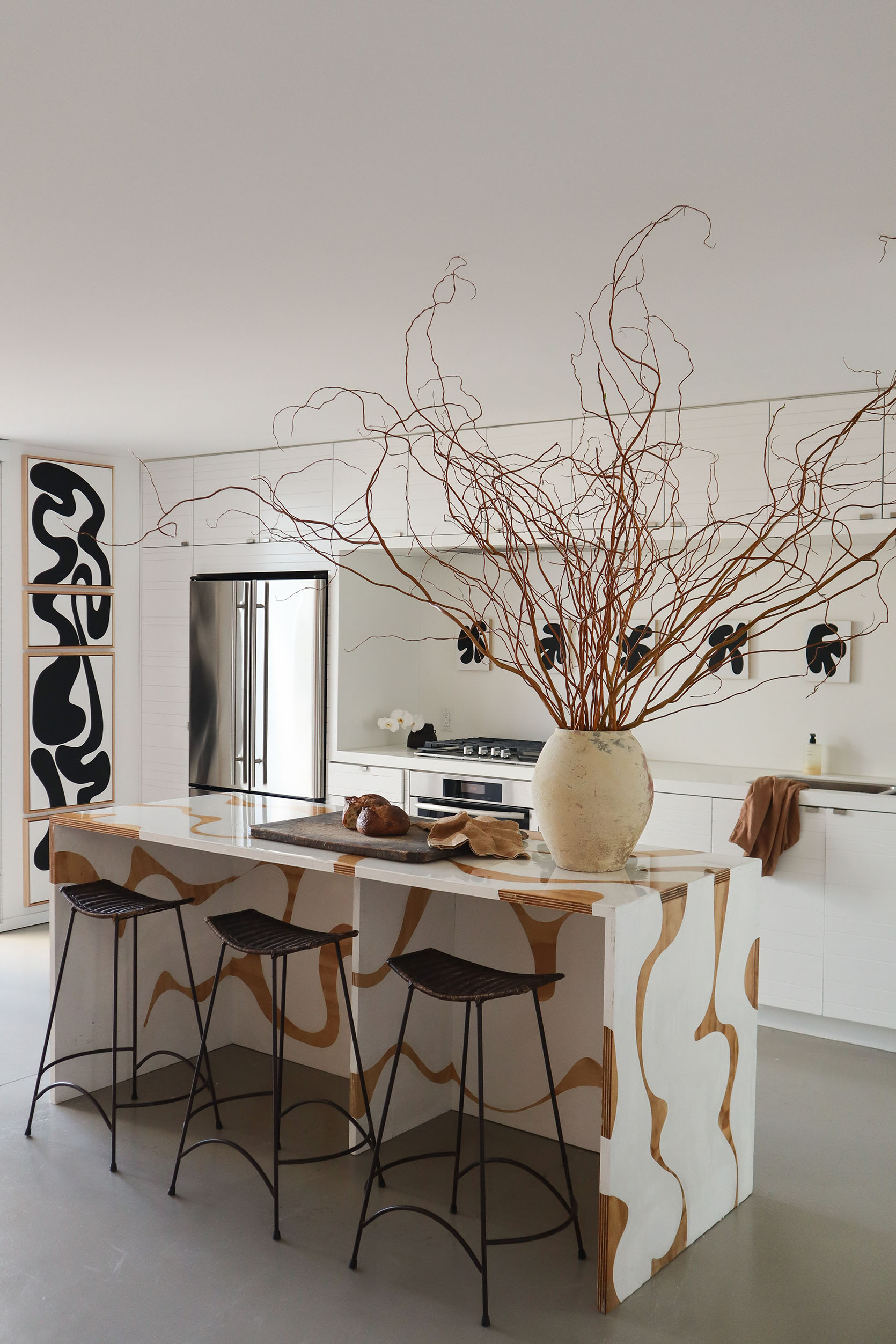 For this next kitchen, artist Hannah Polskin wanted to put her beautiful mark on her minimalist kitchen. Naturally, she decided to customize her kitchen island. With her unique design, this kitchen now has so much movement and joy. I love how free it feels and also what a statement it makes! Step aside marble island:)